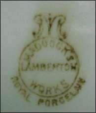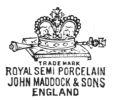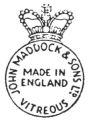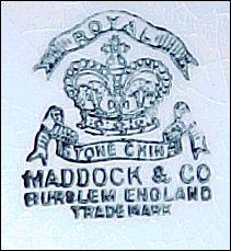 Between 1880 and 1896, he used these trademarks: ![]() ![]() In 1896, he added "Ltd" to his trademark. ![]() ![]() ![]() About 1896 he added "& Sons" to his trademark. ![]() In 1906 he changed "& Sons" to "& Co" but it did not last long. He also added the term "Stone China." He introduced another trademark this year also and added the term "Semi Porcelain". ![]() ![]() Trademark introduced 1927 adding "Royal Ivory" ![]() 1935: ![]() In 1945, one trademark added "Made in England" and the other replaced "Royal Ivory" with "Ivory Ware" ![]() ![]() In 1955 they added part of the Welsh symbol. ![]() Trademark of 1960 ![]() Trademark of 1961 ![]() The Maddock china and pottery are still for sale, many of which appear on EBay